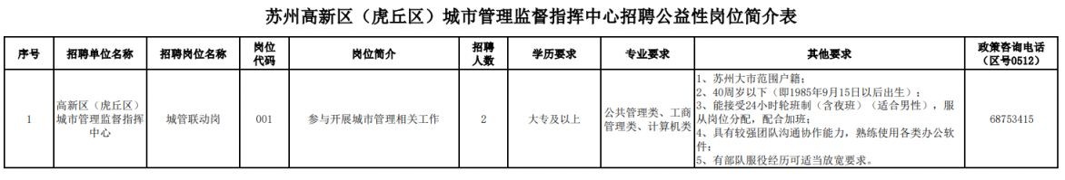 苏州高新区(虎丘区)城市管理监督指挥中心因工作需要,拟面向社会公开招聘公益性岗 ...